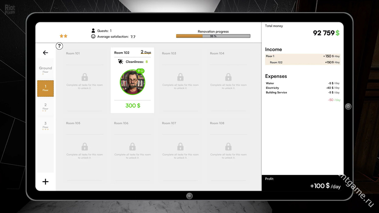 Чем выше стандарты, которые вы поддерживаете, тем больше денег вы зарабатываете. Инвестируйте в удобства и достопримечательности вашего отеля, чтобы выделиться. Купите старый бассейн или ресторан, чтобы привлечь больше гостей! Удовлетворяйте их потребности, поддерживайте порядок в номерах и быстро устраняйте неполадки. Если вы произведете отличное впечатление на гостя, вы получите 5-звездочные отзывы!