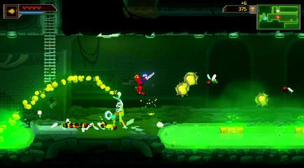 Кровавый фестиваль Metroidvania в пиксельной графике на платформе BMX по мотивам фильма Turbo Kid.