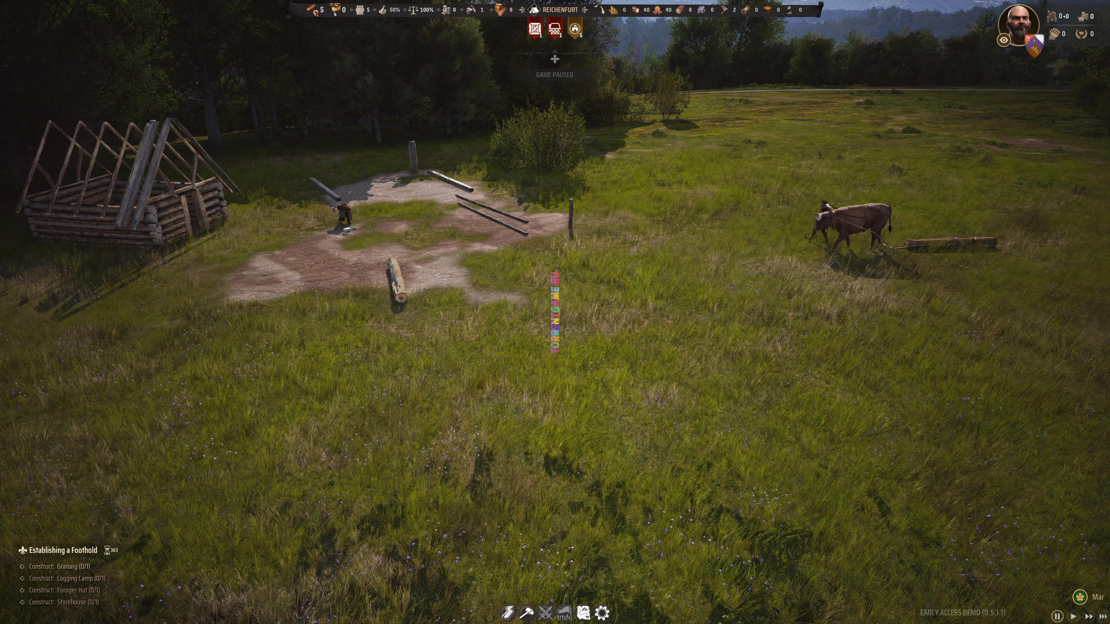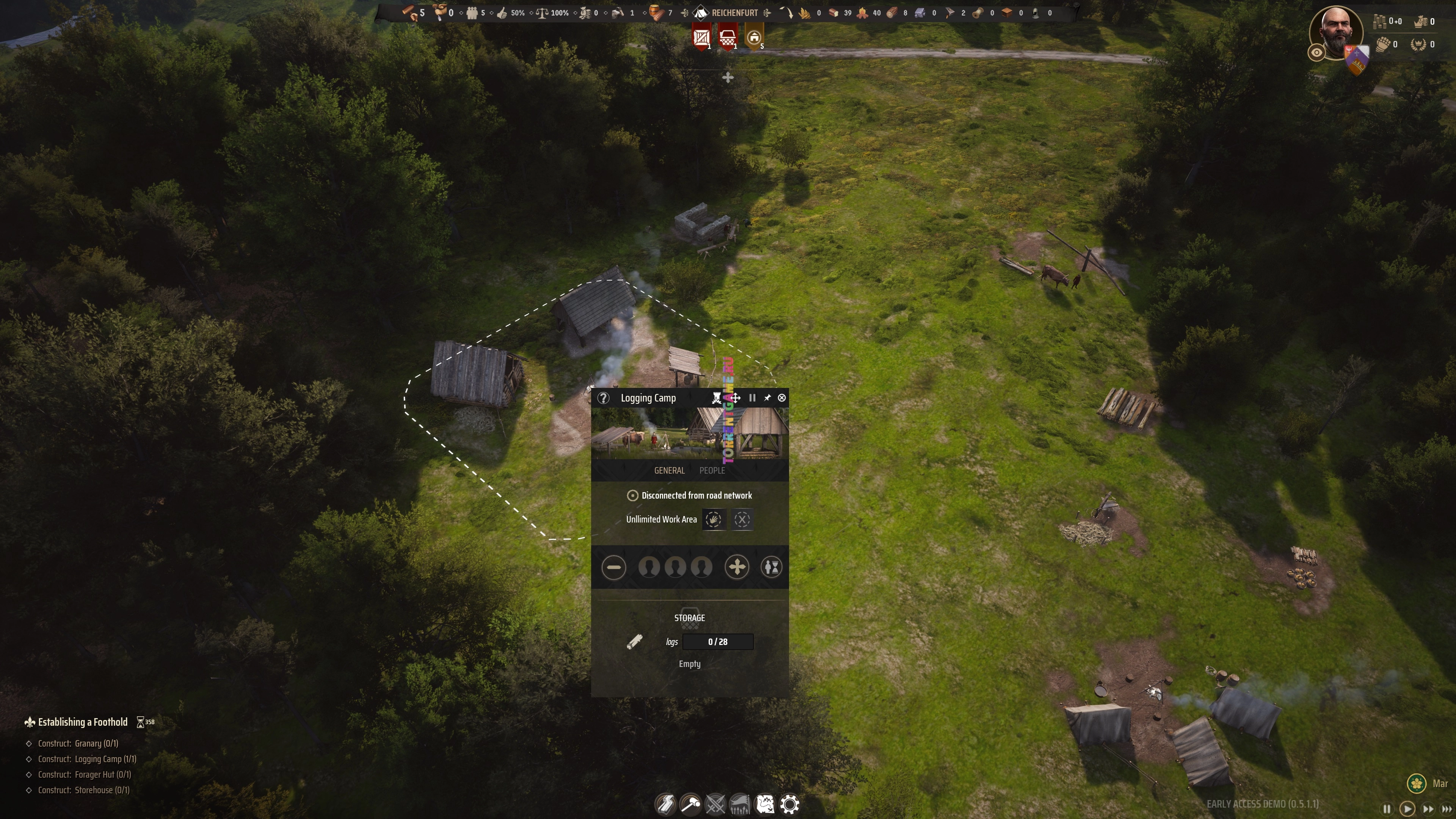 Органическое Рост Города и Логистика: Движок симулирует поселение, где строительство происходит органично (участки под дома), а производственные цепочки физически перемещаются крестьянами. Армия формируется из реального населения. Высокая степень детализации.