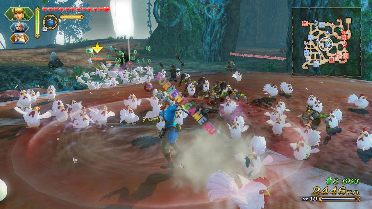 Мгновенно переключайтесь между четырьмя союзниками, чтобы расставлять персонажей в стратегически важных позициях и совершенно по-новому расправляться с врагами. Собирайте рупии и другие полезные предметы, чтобы улучшать оружие и создавать жетоны, которые помогут усилить способности воина.