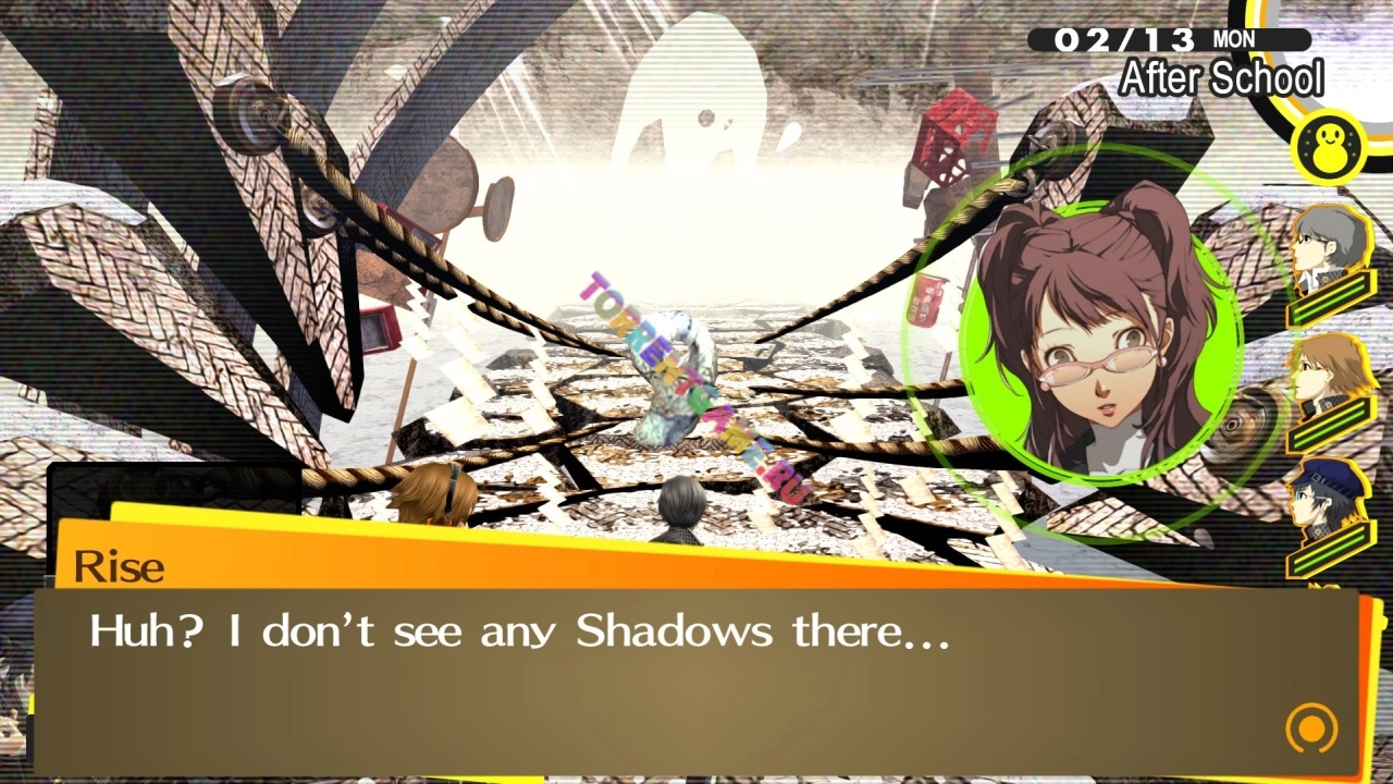 В то же время начинает ходить слух, что если в дождливый день в полночь смотреть в экран выключенного телевизора, то можно увидеть человека с родственной душой. Решая проверить этот слух, группа старшеклассников обнаруживает погружённый в туман мира внутри телевизоров, населённый монстрами, называемыми Тенями. Так же они находят собственных Теневых двойников, символизирующих подавляемые стороны их характера.