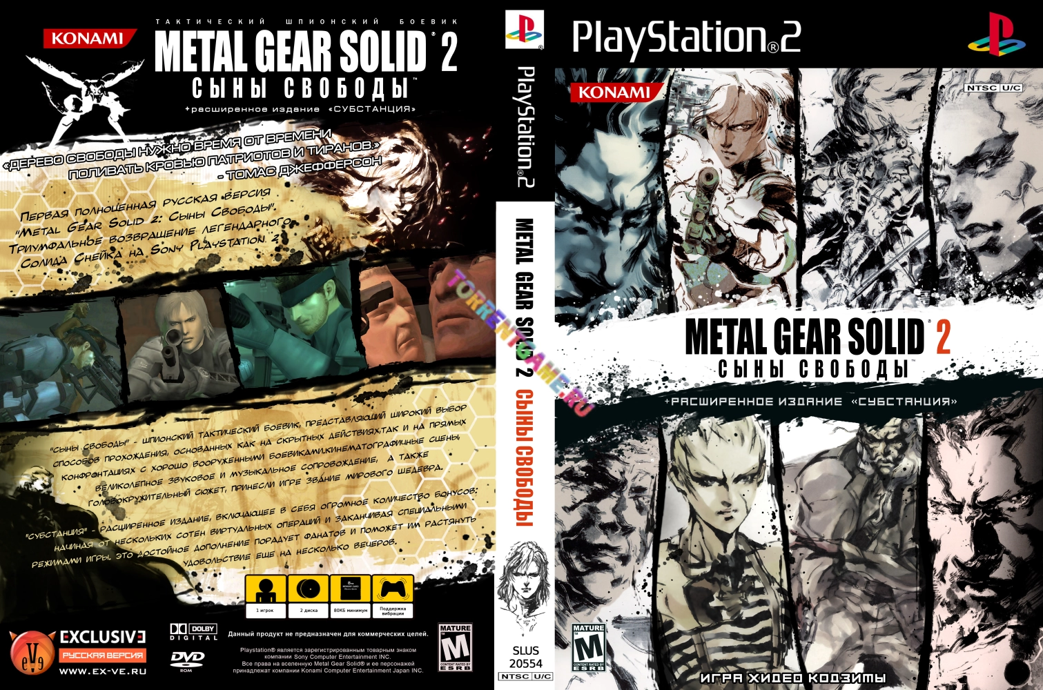 События Sons of Liberty разворачиваются два года спустя после инцидента на Аляске, описанного в первой части игры (подробный литературный пересказ сюжета MGS1 также приведен на диске в виде многостраничной книги). Легендарный оперативник секретного военного подразделения, известный под кодовым именем "Солид Снейк", на пару со своим новым другом Хэлом "Отаконом" Эммерихом основал организацию "Филантропия" с целью противодействия созданию новых модификаций "Метал гира" по всему миру. Следуя таинственной наводке, Снейк незаметно пробирается на замаскированное под гражданский танкер грузовое судно, на котором предположительно перевозится опытный экземпляр смертоносного танка-амфибии. Первоначальная цель получения фотографических доказательств разработки "Метал гира" американским Корпусом морской пехоты подвергается серьезным корректировкам, когда Снейку приходится столкнуться с непредвиденными осложнениями... Substance - расширенное издание, включающее в себя огромное количество бонусов: начиная от нескольких сотен виртуальных операций и заканчивая специальными режимами игры. Находится весь этот доп. контент на втором диске, отдельно от основной игры, которая находится на первом диске.