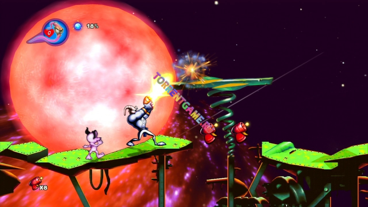Джим - здоровенный дождевой червь, который резко нарастил мозги, когда на него упал ультра-высокотехнологичный-неразрушимый-супер-космический-кибер-скафандр. Скафандр был украден у доктора Обезъяноголова, который создал его для Королевы Пульсирующе-раздуто-гнойно-потно-сочащейся Уродливой Слизнезадницы и который должен был вернуть Психоворон. Увы, последний перестарался и скафандр упал на землю, прямиком на Джима, что создало весьма неординарного героя. В друзьях у него инопланетный щенок, а влюблен он в принцессу Как-Там-Её-Зовут. Джим подслушал переговоры Психоворона с Королевой Слизнезадницой о её планах в отношении её сестры, в результате Джим отправился спасать принцессу, побеждая на своём пути множество врагов. Особенности игры: Бегайте, стреляйте, используйте хлыст, запускайте коров, прыгайте с невообразимых высот и плавайте в подводных уровнях.