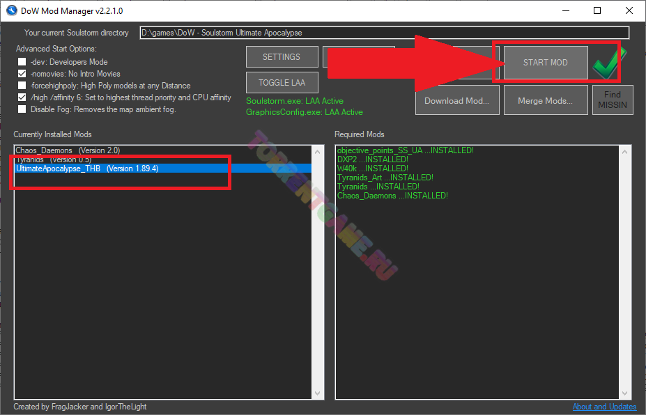 В нём необходимо выбрать строчку "UltimateApocalypse_THB (Version 1.89.53)" и нажать "START MOD".