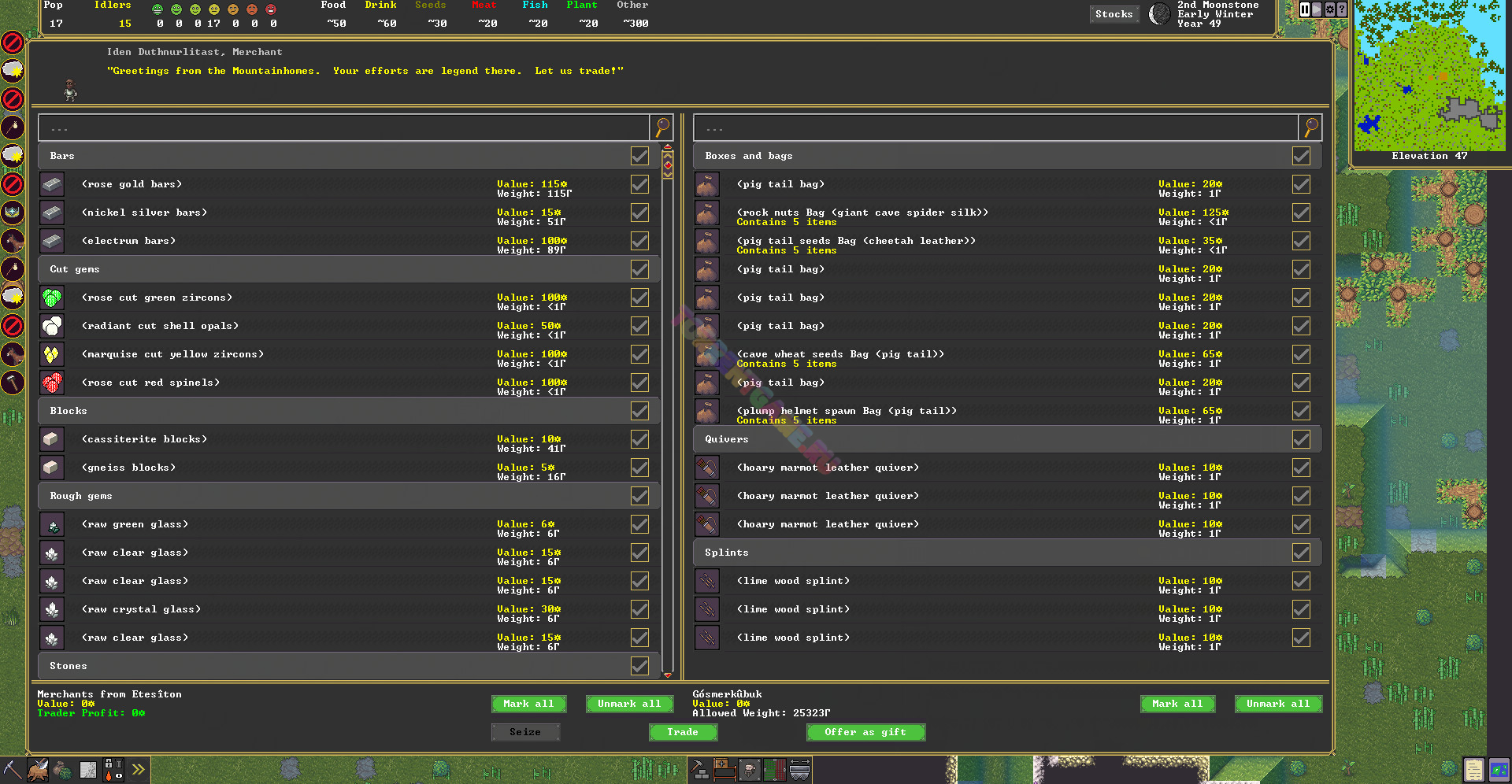 Трудно передать глубину этой генерации. Сотни животных и монстров, многие из которых создаются случайным образом для каждого мира, а также сгенерированные стихи, музыкальные формы, инструменты и танцы, которые ваши дварфы могут практиковать и исполнять. Динамическая модель погоды отслеживает ветер, влажность и воздушные массы для создания фронтов, облаков, штормов и метелей. В соответствующих геологических условиях может появиться более двухсот типов горных пород и минералов.