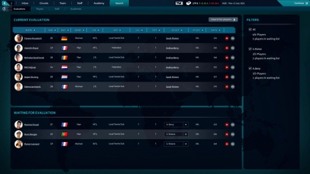 Создайте свою команду: У каждого игрока есть свой набор сильных и слабых сторон, которые вам придется учитывать, чтобы привлечь их и извлечь из них максимум пользы. Десятки параметров определяют поведение каждого игрока как на поле, так и за его пределами. Стиль игры, любимое покрытие, морфология, характер, физическое состояние: все эти аспекты делают каждого игрока уникальным. Как менеджеру, вам предоставляется набор аналитических инструментов, которые помогут вам лучше понять своих игроков и проследить за их эволюцией с течением времени.