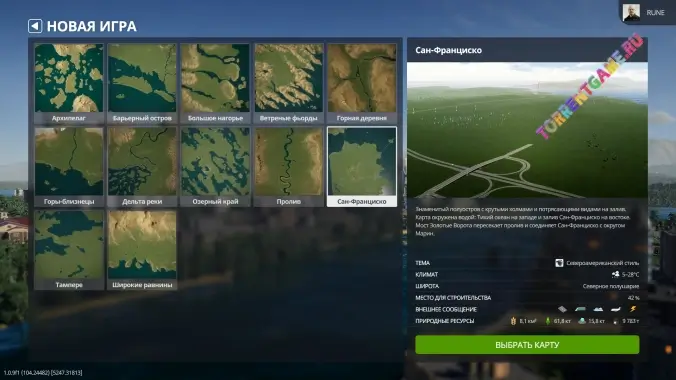 Выбор карты определит климат вашего города. Расширяясь, вам придется считаться с силами природы, изменчивой погодой и сезонными трудностями.