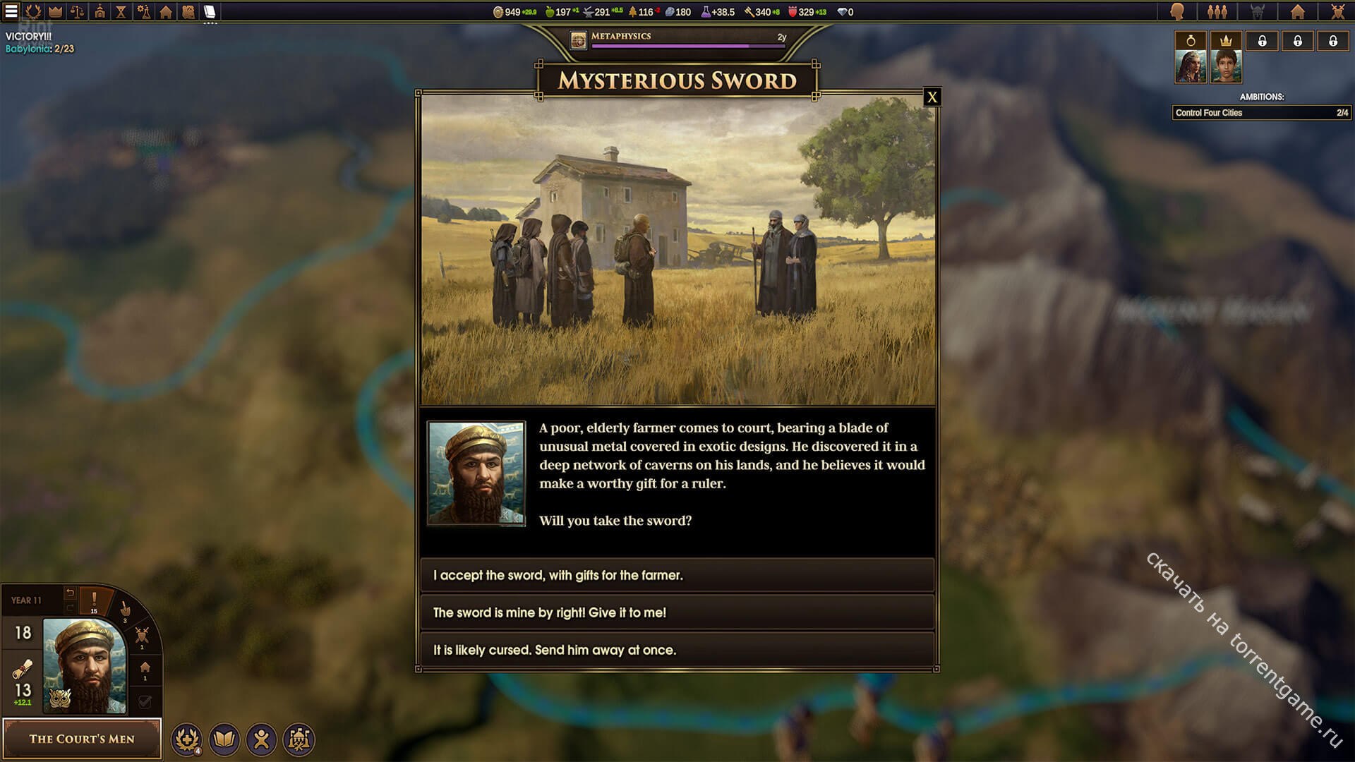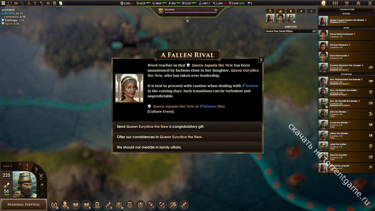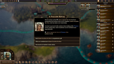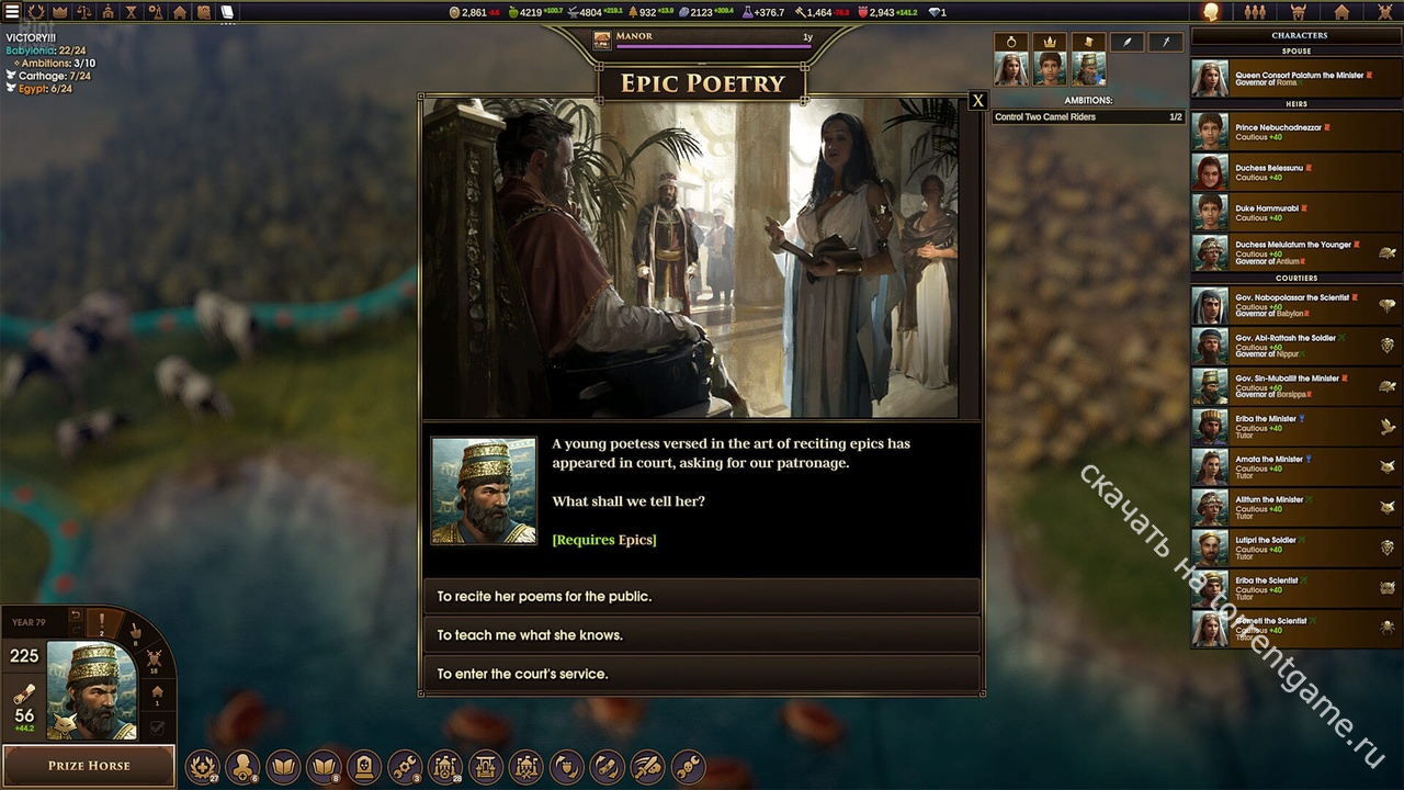 Амбиции – Ваша династия добивается победы, выполняя 10 амбиций, каждая из которых сложнее предыдущей. Эти амбиции динамически генерируются на основе событий вашей игры и желаний ваших персонажей. Никакие две игры никогда не будут проходить одинаково, и мудрый правитель будет знать, когда изменить направление.
