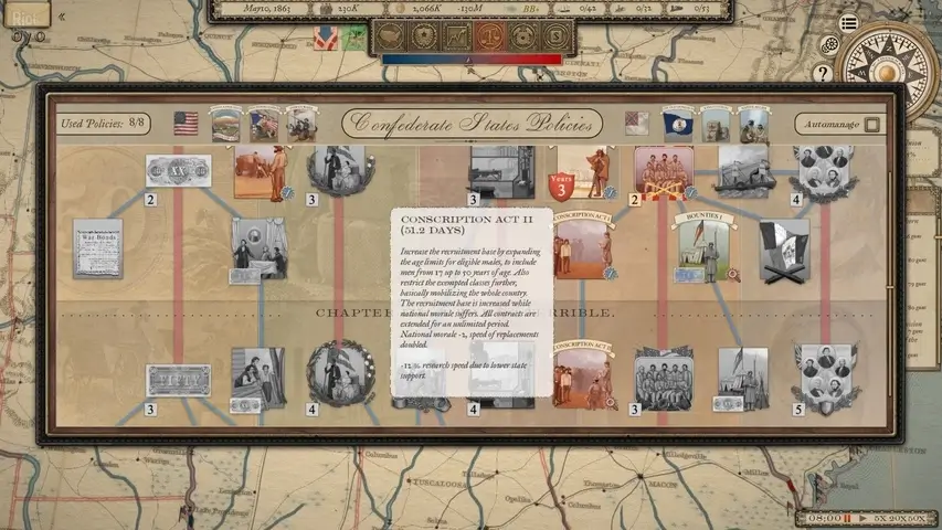 От форта Самтер до Аппоматтокса: внимательно следите за моральным духом своих граждан и войск. По мере того как война затягивается, пыл сменяется усталостью, казна грозит иссякнуть, а такие меры, как составление законопроекта, вызовут беспорядки.