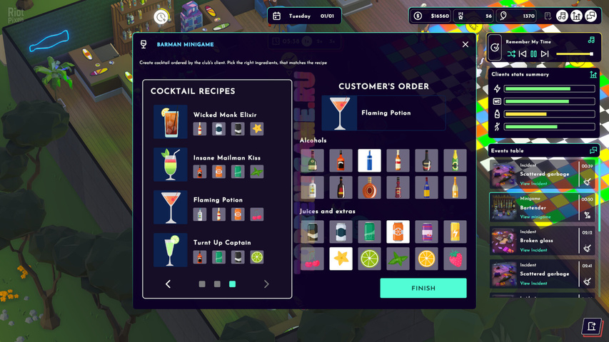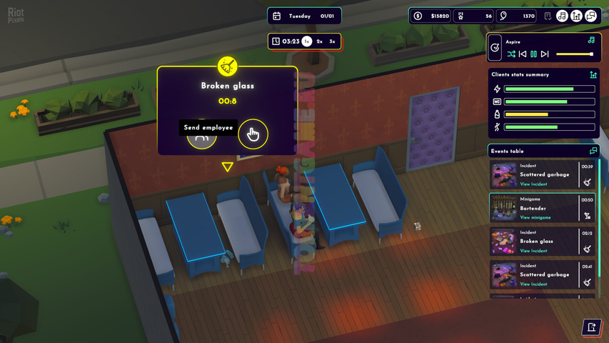 Ваш успех зависит от удовлетворенности клиентов. У каждого гостя есть свои индивидуальные потребности, которые вы должны удовлетворить, чтобы удержать их в клубе. Предпочитают ли они элегантные напитки в стильных бокалах для коктейлей? Или, может быть, они хотят танцевать под лучшие хиты до рассвета? Ваша задача будет заключаться в том, чтобы музыка, атмосфера и обслуживание соответствовали их ожиданиям. Заботьтесь о своих клиентах, и благодаря этому они будут рекомендовать ваш клуб другим, тем самым повышая вашу репутацию. Реагируйте на неожиданные события – пролитый алкоголь, засорившийся унитаз или пьяного клиента, у вас будет полно дел!