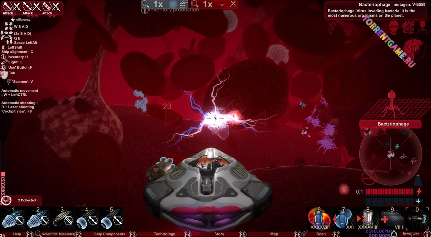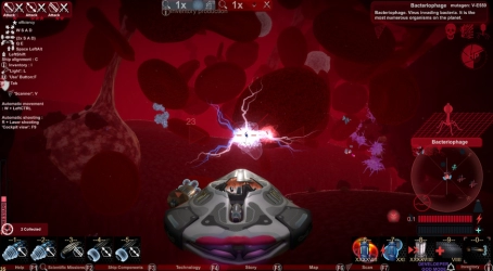 Это путешествие в один конец, вашему кораблю нужны топливо и воздух, чтобы поддерживать работу систем. Вы можете добывать ресурсы из мертвых микробов или извлекать минералы из крови и питательные вещества внутри организма. Затем вы можете преобразовать эти ресурсы в важные предметы, которые помогут вам в вашей миссии. Вы можете создавать оружие, лазеры для добычи полезных ископаемых, щиты, двигатели и другие компоненты кораблей. Вы также можете обновить программное обеспечение вашего корабля, чтобы увеличить скорость и энергию.